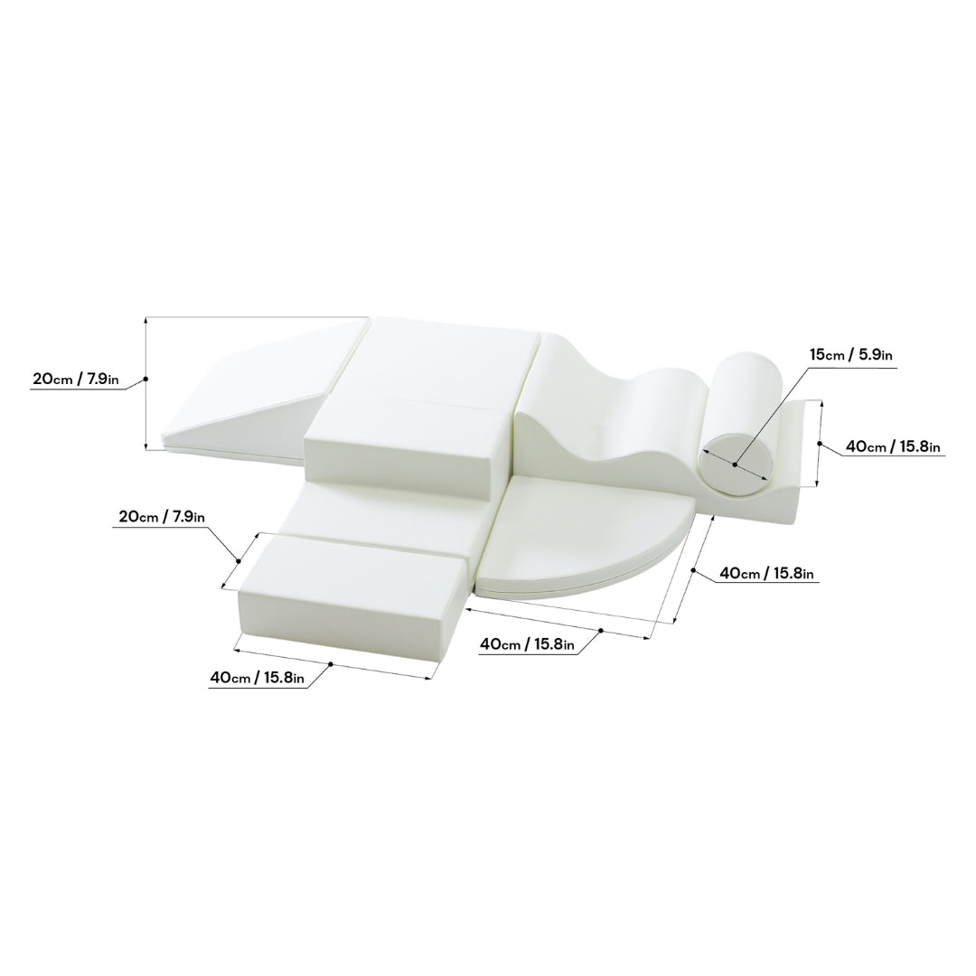 This set includes various soft play shapes, including ramps, corners, and wedge in white color. Toddlers can assemble them to create exciting structures that promote motor skills and problem-solving - perfect for a Montessori toy. Whether it's an expedition through hidden caves, a journey through a magical forest, or simply a cozy hideaway, this playset inspires imaginative storytelling and role-play.